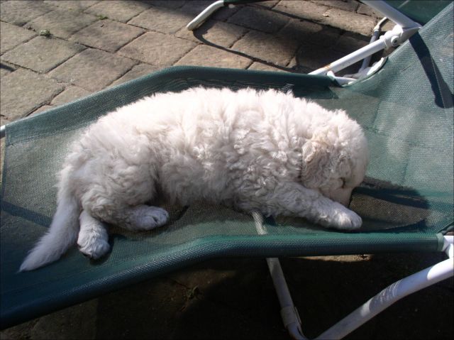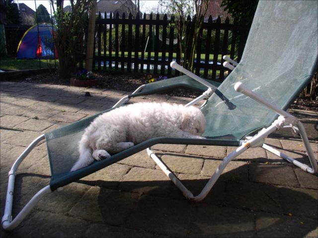 ...nach so einem tollen Ausflug ist ein Sonnenbad in Frauchen’s Liegestuhl genau das Richtige!!!!! |