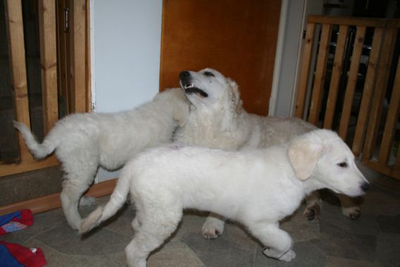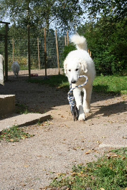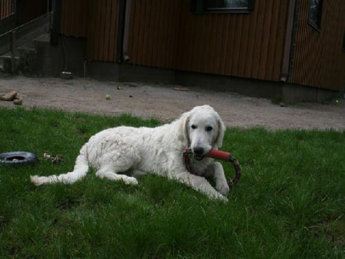 | Zitat aus Email vom 23.03.08 | … Everything is still going very well! Pyry is fully housetrained. He eats well. He might sleep 3 hour in a daytime. We let him sleep as much as he likes, it's said, that a puppy grows and get strenghten while they sleep. Have the other puppy owners reported, how much their puppies weight? Pyry weights 24 kg in age of 4 moths. |