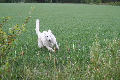 since the age limit is 7 months, so the real showseason starts now. The result was: honorable price, best on breed puppy. Once again we got a good judgement: Slightly low limbed, proper bone structure, right lined head on top as well as viewed from the side, good eyes and ears, excellent pigmentation, proper upper line, rounded front, good angelations, excellent coat quality, sufficient step lenght, high positioned tail. Next shows for us are: 26/7 International dog show, Pori 27/7 Dog show, Turku I´ll send you some pics again. We're doing fine with Pyry. He's very attached to me, when we're out he follow me step by step or he lays down beside my feet. He is nice also for the other members of our family, but for me he's somewhat different. We'll see how he will relate to our guests, since we have a confirmation party on next weekend and there will a lot of strange people. |