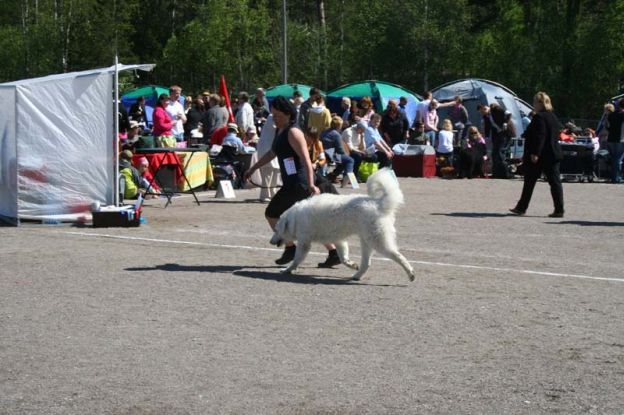 somewhat older than Pyry, 1 year and 5 months. But there was no need to be nervous. The judge came from Croatia and the evaluation was really short. BOB, CC (cerficate) -”Really beautifull head, impeccable bite, good head line, strong bone structure, coat is well maintained.” |