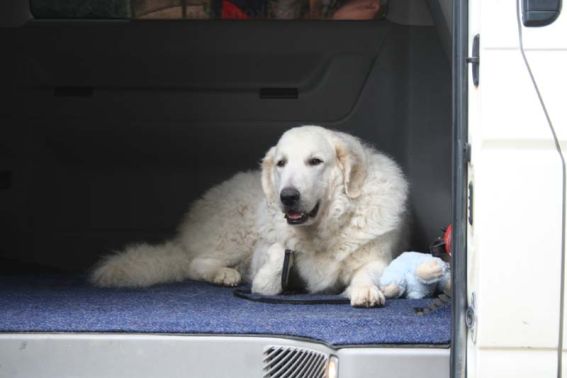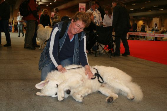 Und so machen wir es immer auf den Ausstellungen: Erst die Vorstellung im Showring, dann den ersten Platz belegen, und sich dann gemütlich von Frauchen durchkraulen lassen, während wir auf die Papiere warten ... |