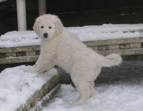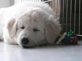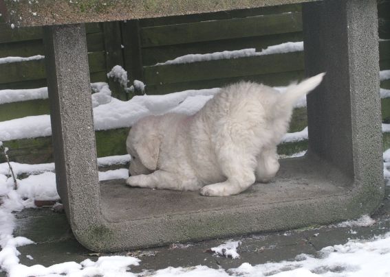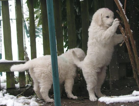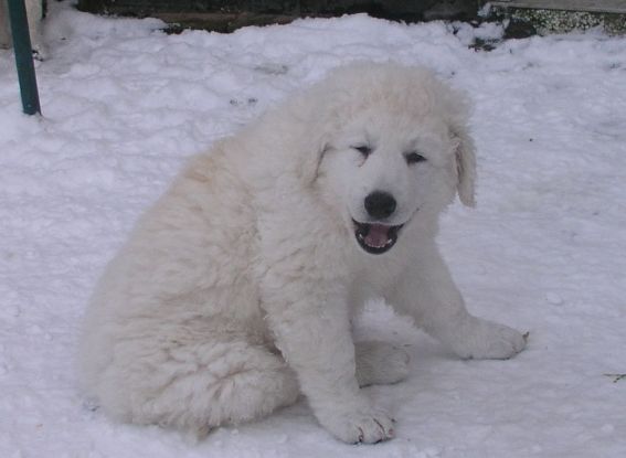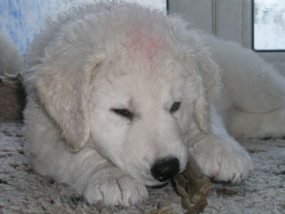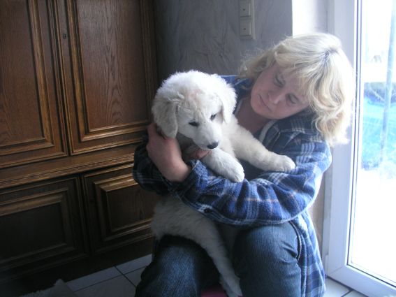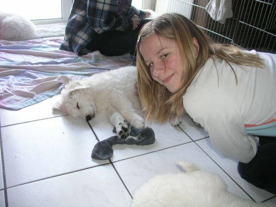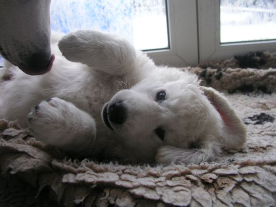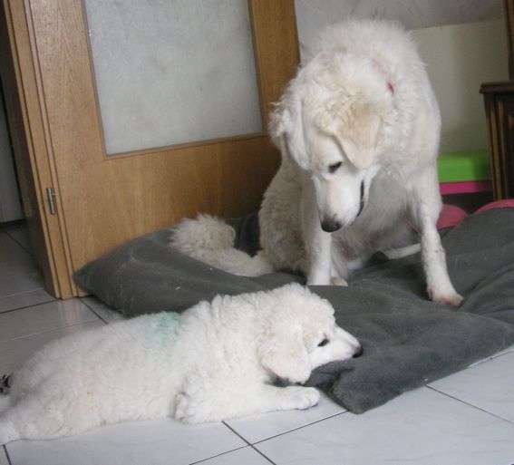 große Schwester Bjela kümmert sich liebevoll um Hündin "grün"