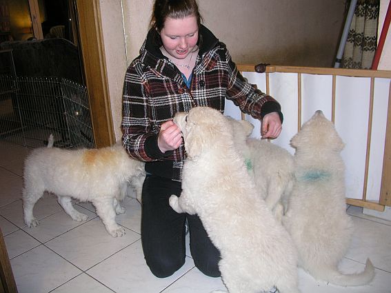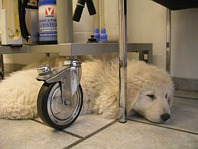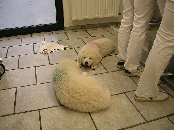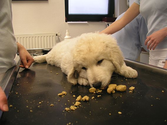 sich dann aber von Leckerlies die auf dem Behandlungstisch verteilt werden,