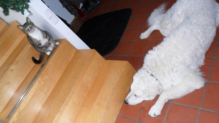 und Kater Bruno kann sich nach oben in Sicherheit bringen, wenn es ihm
